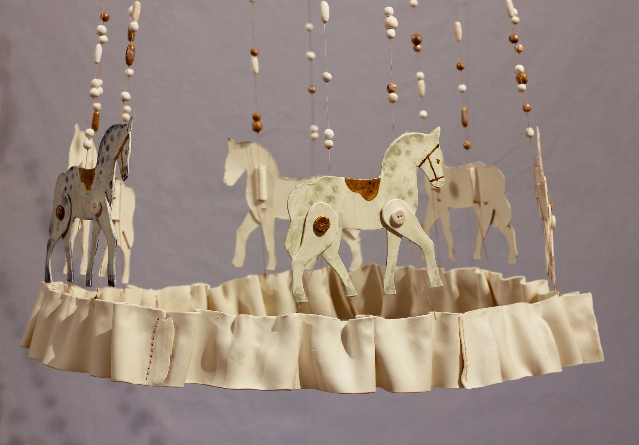 Mes pièces, entre structures et parures, évoquent le textile, le bijou, de là naissent des mobiles et des objets à l’échelle du corps, ambigus et sensibles. Au travers de drapés presque fossiles et de fragments cousus, je poursuis une recherche autour des objets intimes, porteurs d’histoires, et crée ainsi des réceptacles où la porcelaine devient support de récit.